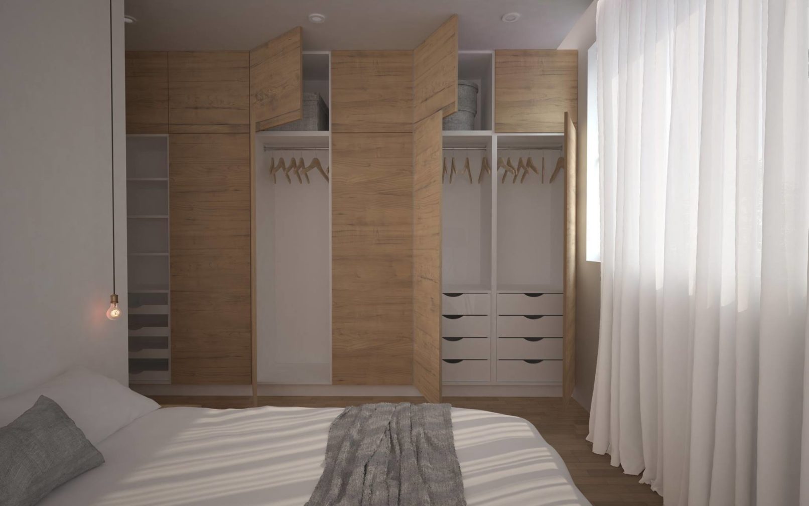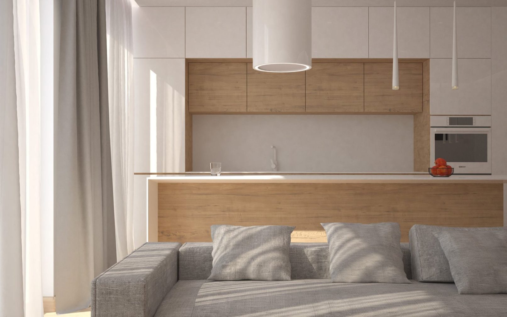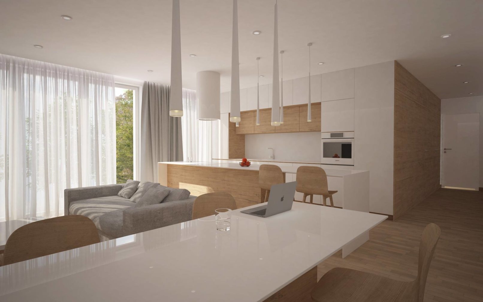 Założeniem projektowym było stworzenie nowoczesnego i minimalistycznego mieszkania, o jak najmniejszej ilości mebli wolnostojących. Mieszkanie ma odpowiadać potrzebą trzyosobowej rodziny. Ważnym założeniem projektowym było wytworzenie dwóch przestrzeni. Prywatnej, dostępnej dla domowników i dziennej. Wielkim atutem były przeszklenia każdego z pokoi, które prowadzą na taras. W mieszkaniu dominują trzy kolory, które dopełniają się wzajemnie i tworzą wspólnie harmonie wnętrza. Wysoka zabudowa szafowa jest idealnym odpowiednikiem na potrzeby rodziny. Ważnym elementem mieszkania było oświetlenie, które zostało przewidziane w trzech wariantach.